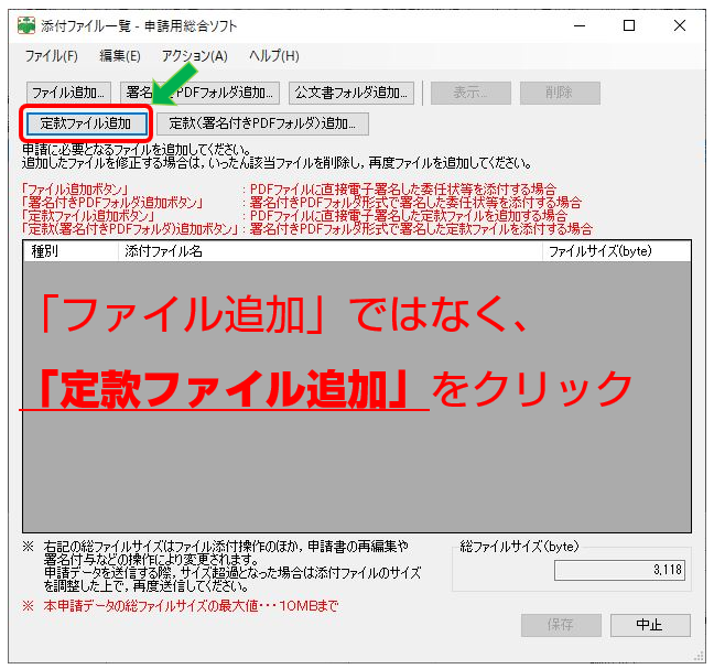 動画(17:06)では、Acrobatで電子署名した定款を「ファイル追加」から添付していますが、新たにできた「定款ファイル追加」から添付する方法に変更されています。