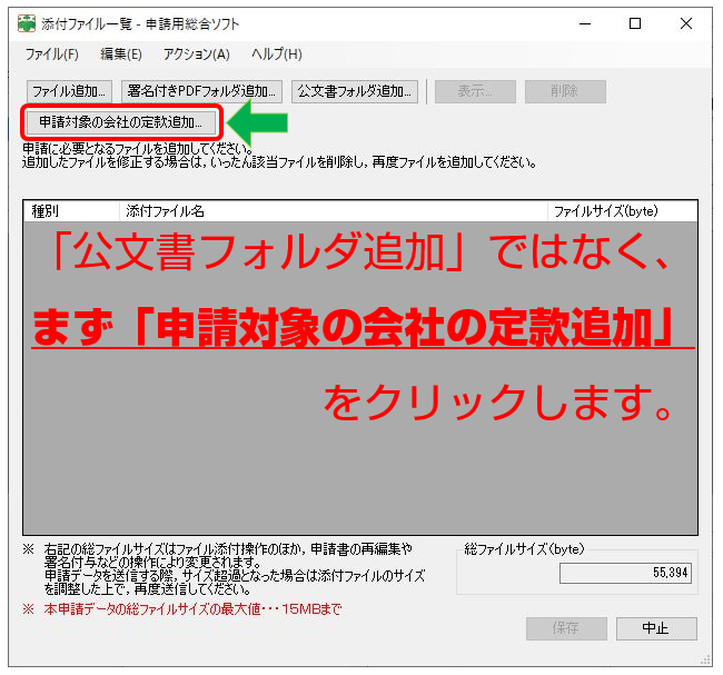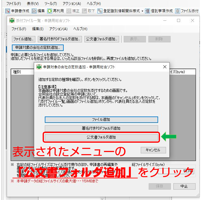 動画(25:00)では、公証役場から受け取った認証済みの定款フォルダを「添付ファイル一覧」に表示されている「公文書追加フォルダ」から添付していましたが、新たにできた「申請対象の会社の定款追加」をクリックして、表示されたメニューの「公文書フォルダ追加」から添付します。